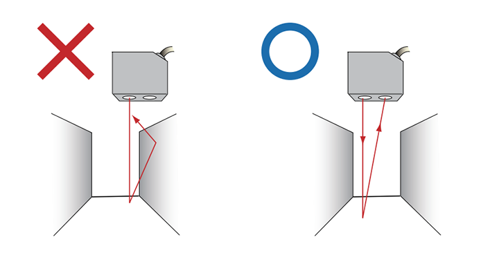 感應頭周圍存在壁面時,投射激光經過壁面反射回的亂光會導致測量的偏差。若安裝環境限制使得傳感器必須緊挨著壁面安裝時,請將傳感器的投光光軸和受光光軸構成的平面平行于壁面。且將壁面處理為低反射率的黑色表面,以降低壁面的反射光量。
