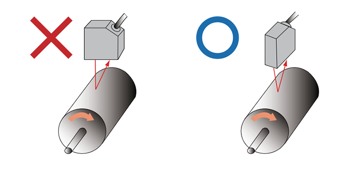 測量旋轉物體時,請將傳感器的投光光軸和受光光軸構成的平面平行于旋轉物體的旋轉軸,這樣可以最大程度的抑制旋轉物體上下晃動或位置偏移所帶來的影響。
