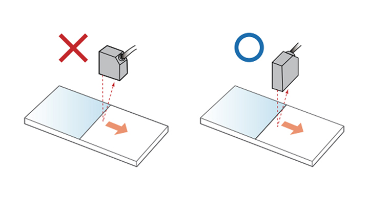 被檢物的材質‘顏色存在明顯差異的情況時,請將激光位移的投光光軸和受光光軸構成的平面平行于被測物材質(或顏色)差異分界線,這樣可以減少測量的精度誤差。