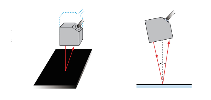 被測物為黑色物體時,反射光量較少,使得受光素子的受光量較少,導致分辨率下降??梢酝ㄟ^縮短檢測距離,讓有效測量范圍內盡可能的縮短傳感器的檢測距離,確保受光素子接收到足夠的受光量。也可以【正反射】方式傾斜安裝,時激光的入射角等于反射角,這樣提高受光素子接收的受光量。