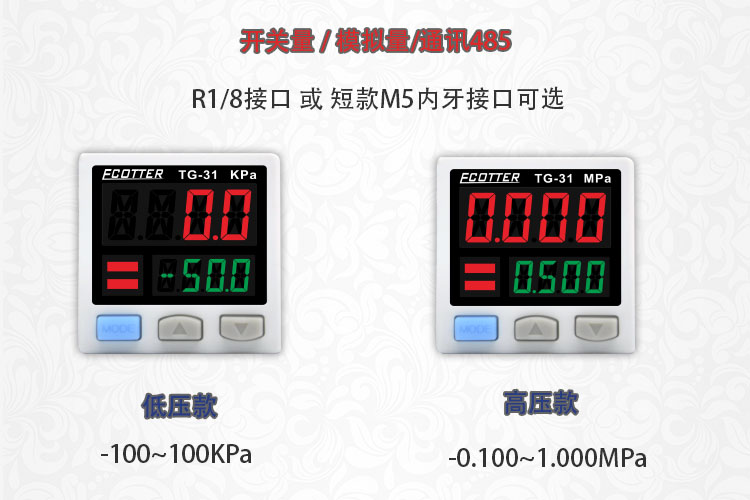 ECOTTER數顯壓力表有高壓款-0.1~1mpa 和 低壓款 -100~100kpa兩種量程不同的規格,低壓款常用于負壓檢測。這個系列產品有開關量、模擬量及通訊485款可選。