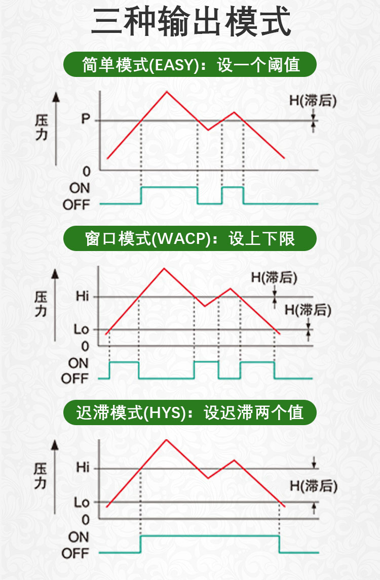 ECOTTER數顯壓力表可實現智能檢測,多種輸出模式,簡單模式可設置一個閥值,窗口比較模式能設上限和下限兩個閥值,進行區間輸出。還有應差模式,設置兩個閥值,起到遲滯的效果。