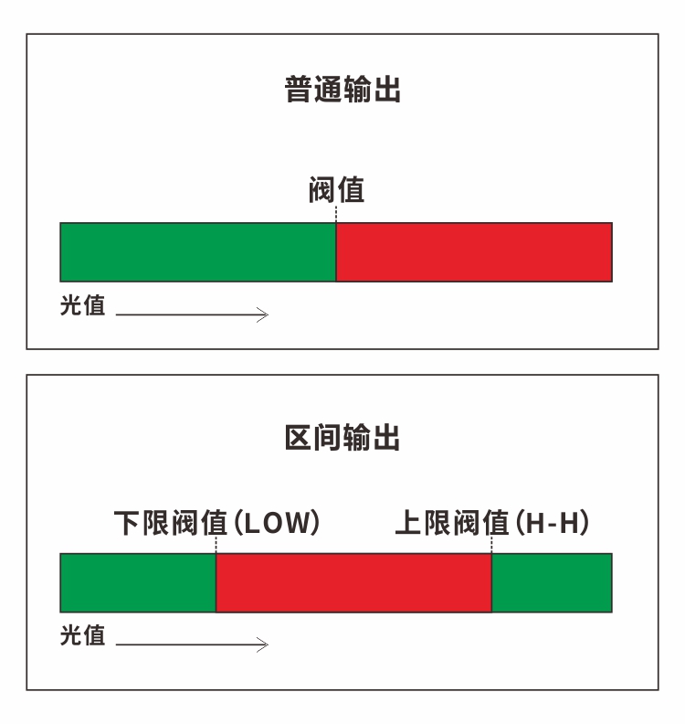 光纖放大器普通的檢測(cè)輸出方式是設(shè)置閥值,光值大于或小于閥值輸出信號(hào),檢測(cè)有無。而FG-40-H的區(qū)間輸出功能可以選取光值區(qū)間的中間部分輸出,功能更豐富,可以應(yīng)對(duì)更復(fù)雜的場(chǎng)景。