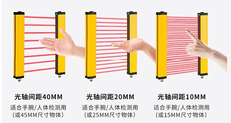 安全光幕通過不同光軸間距的選擇來決定保護的部位,光軸間距越來密集,保護的就越細致,根據(jù)光幕安裝的位置、離危險設(shè)備的距離選擇適合的款式。