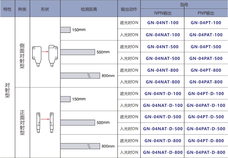 ECOTTER 超薄對射光電開關 GN-04T系列 有正面對射和側面對射款,安裝距離(檢測距離)可選100mm\500mm\800mm,可根據應用情況選擇。