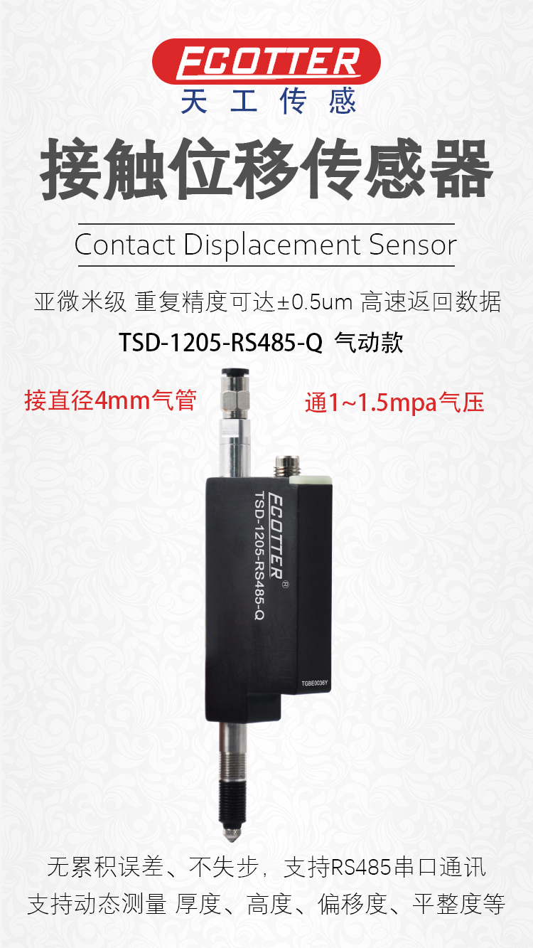 ECOTTER 氣動款 接觸位移傳感器 TSD-1205-RS485-Q 由 深圳天工 自主研發,通過光學絕對值直線編碼器原理,使傳感器具備高分辨率,不產生累積誤差,不產生失步。支持串口通訊,多種量程規格可選。可測量厚度、距離、直徑、偏移度、平整度等。