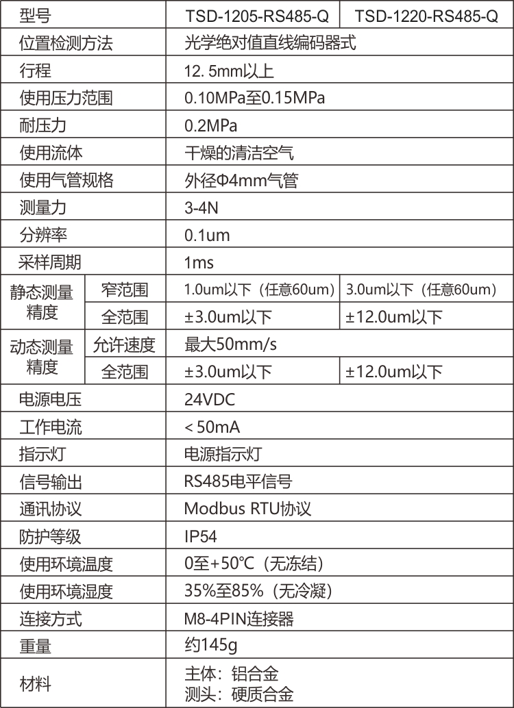 TSD-1205-RS485-Q為氣動型,由氣管接口可接直徑4mm氣管,通0.12~0.17mpa氣壓推出探桿,測量精度可達3um。支持RS485 modbus rtu ,可高速返回數據每秒1000次,實現動態測量。