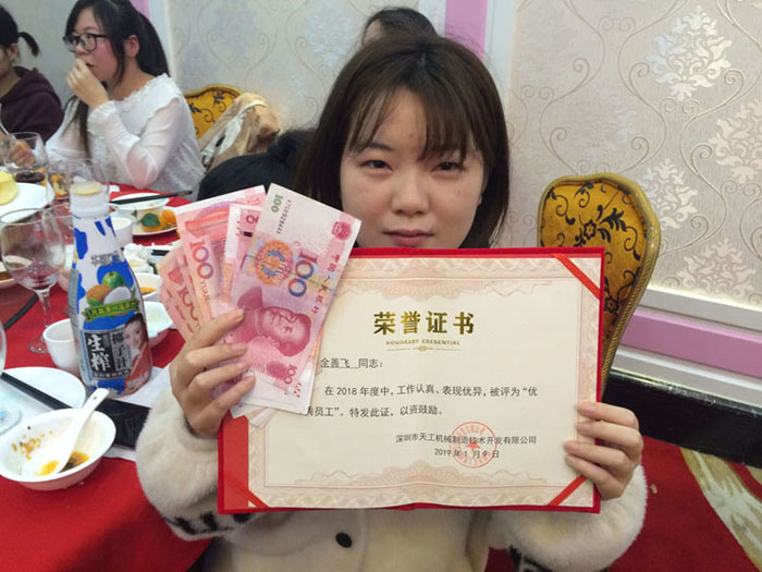 最后,我們為當晚的幸運兒表示祝賀,為優秀員工表示崇高的敬意。2018已經結束,2019才剛剛開始,讓我們天工的家人們一起乘風破浪、披荊斬棘,把2019裝飾成一個更美好的明天。天工機械加油,2019加油!