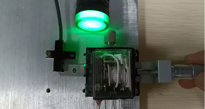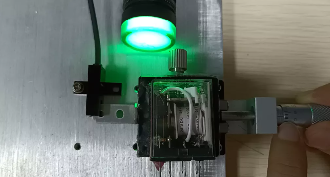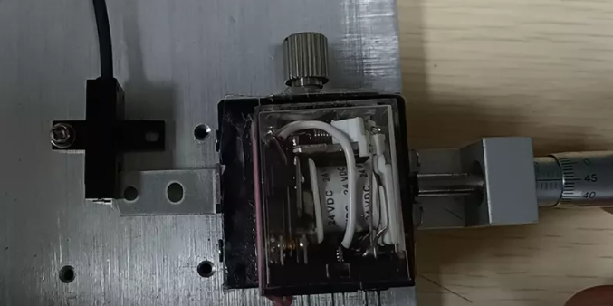 這里有一個重復精度測試儀器,我們可以通過旋動標尺推動另一端的物塊前進,直到傳感器發出信號,此時我們記錄下這個標尺的位置。