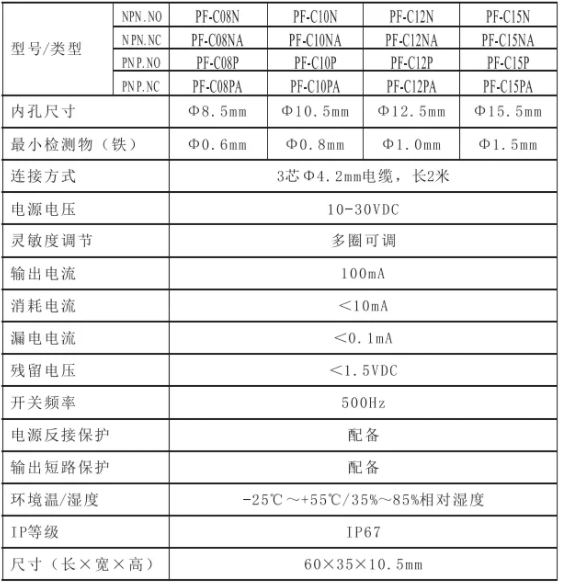 這款接近開關的整體是環形,檢測區域為圓型,有多種尺寸可供選擇。其最小檢測物體也隨著檢測區域大小的變化而變化。最小檢測物可檢測0.6mm的磁性物體(孔徑8.5mm)
